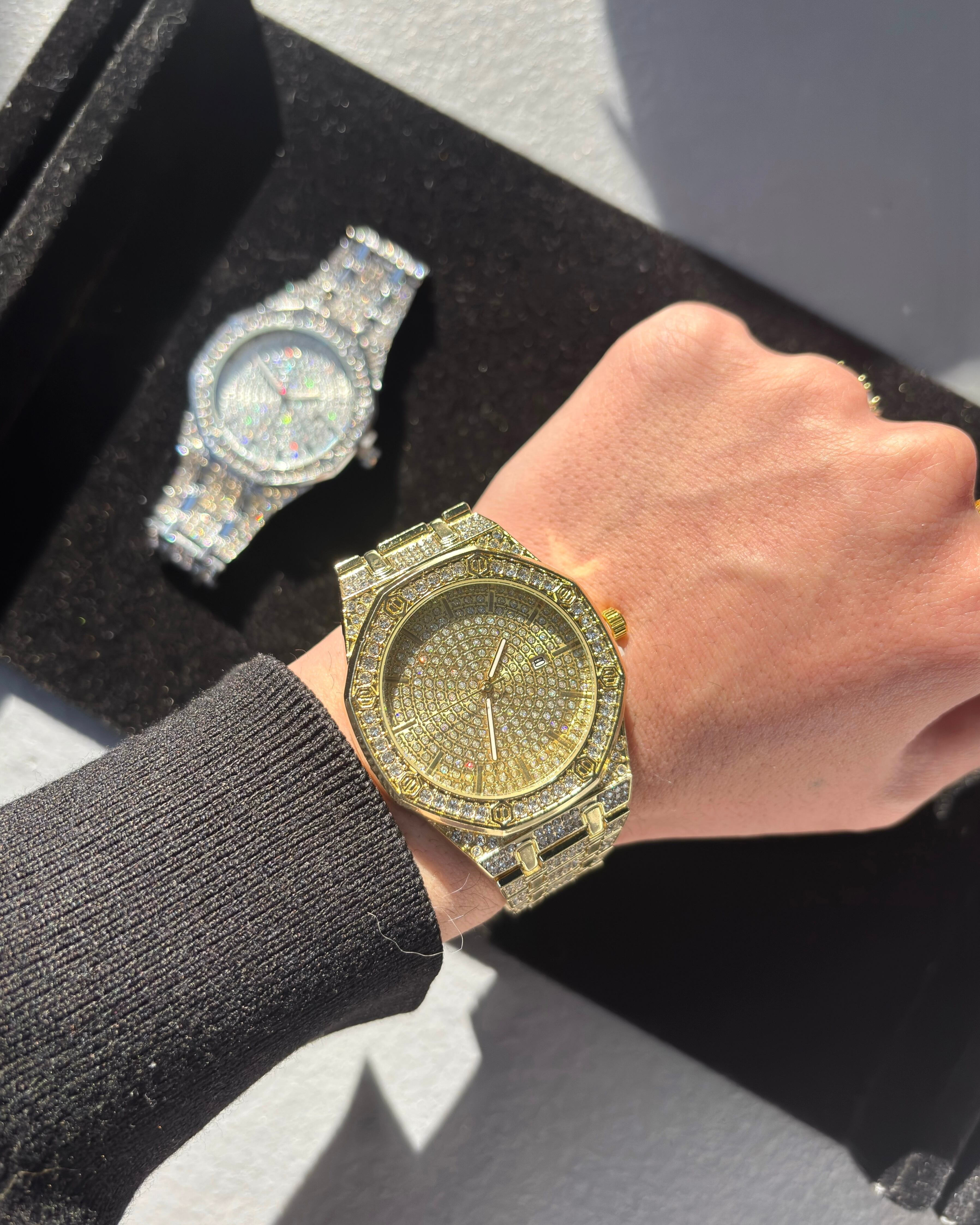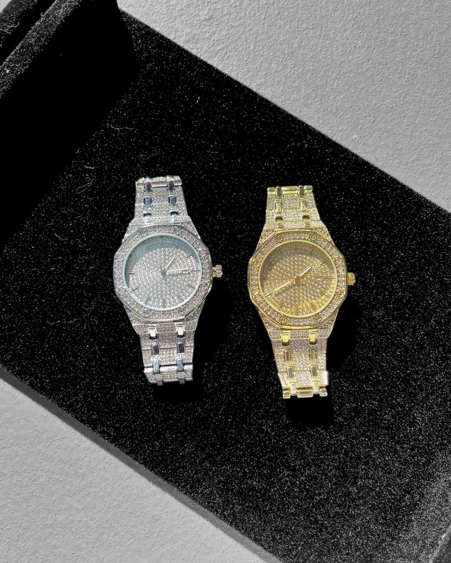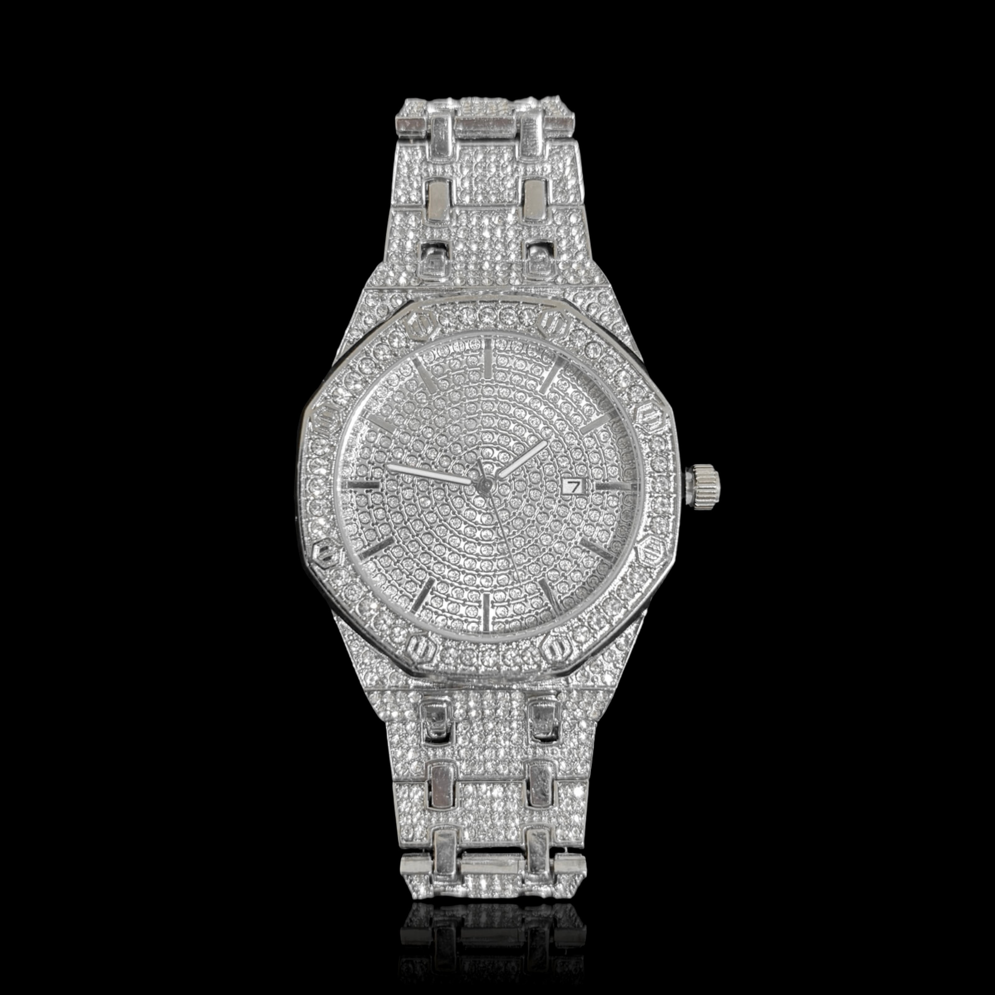 フロントからベルト部分に散りばめられたジルコニアによって存在感ある腕時計となっております。